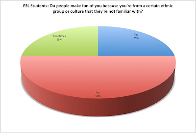 and 25% for yes saying that people do discriminate against them even if there from another culture and speak a different language and slang, for my Non-Esc there was a large amount of people (56%) that said that sometimes people make fun of them because they are from somewhere different, 33% of the people said that yes they are being picked on from others, and 11% of the people said no they are not at all getting picked on, so there's just different people with different opinions about language.
